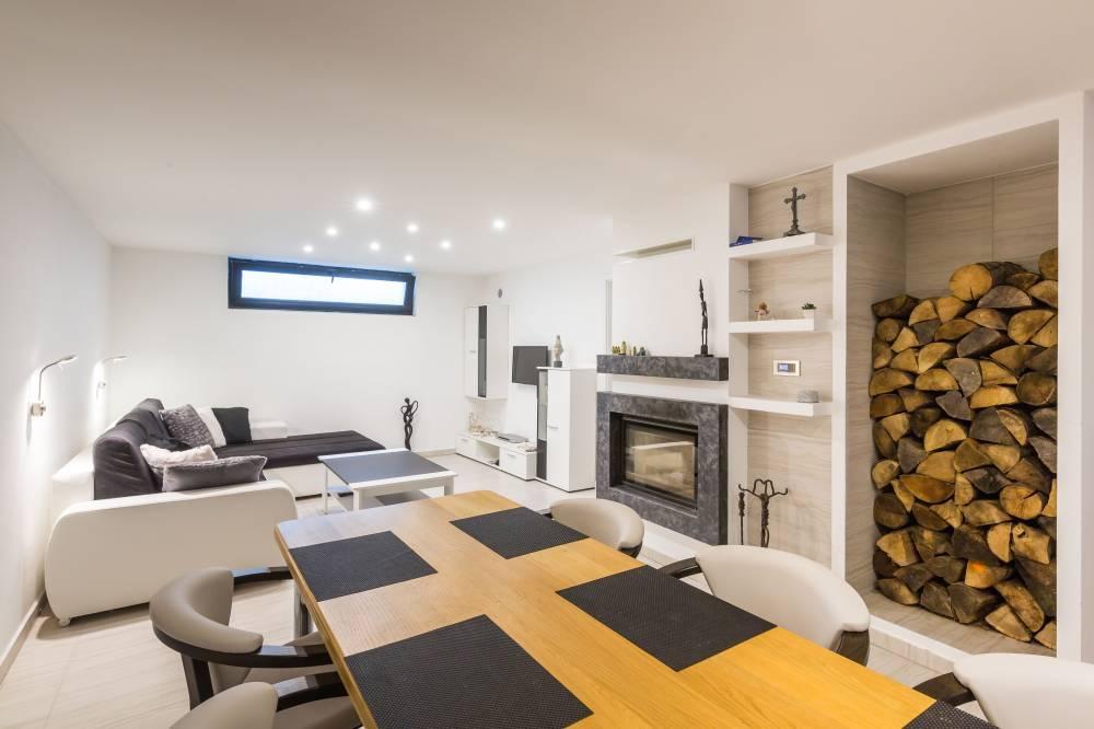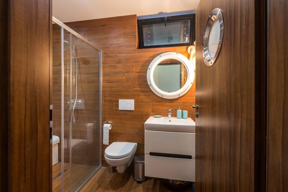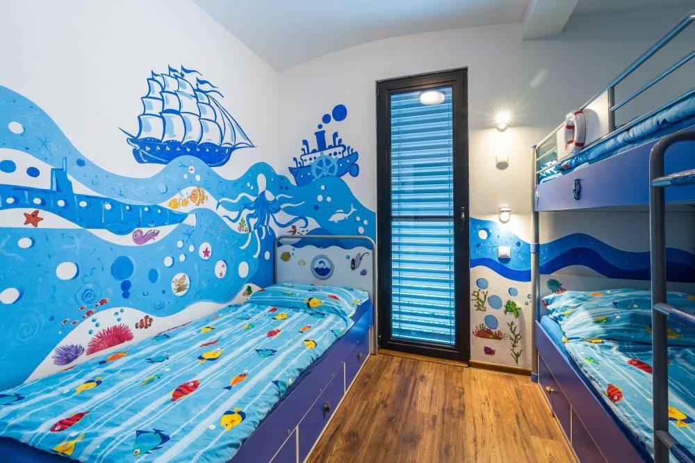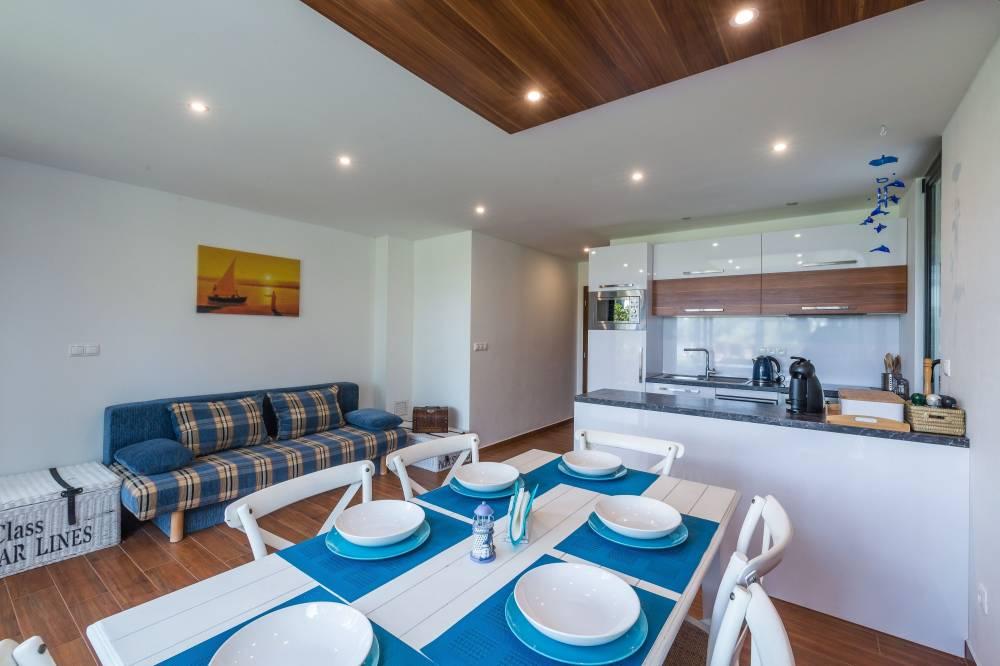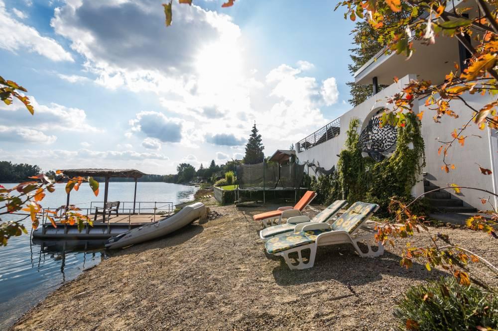 Spoločne pre oba apartmány je k dispozícii veľká spoločenská miestnosť s krbom, barovým pultom a fínskou saunou v suteréne apartmánového domu, ako i vonkajšia záhrada, záhradný altán, vonkajšie ohnisko, vybavená lodenica, mólo a súkromná pláž s lehátkami. Celková kapacita apartmánového domu je 10 pevných lôžok a 2 prístelky.