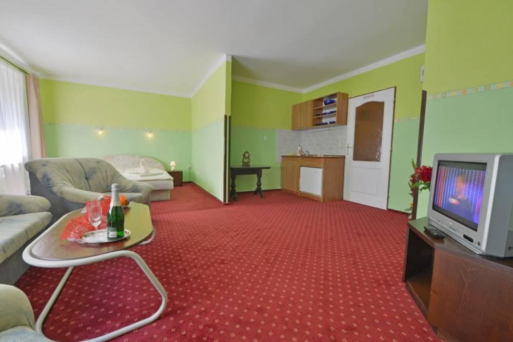 Apartmán: väčšia izba, kuchynský kútik, vaňa, sociálne zariadenie, telefón, chladnička, Tv, wifi pripojenie, trezor